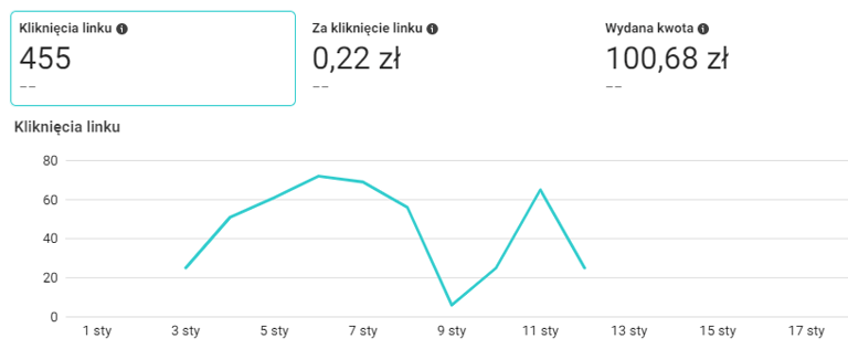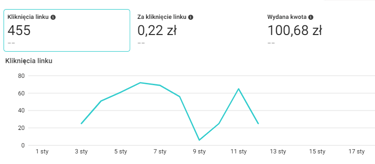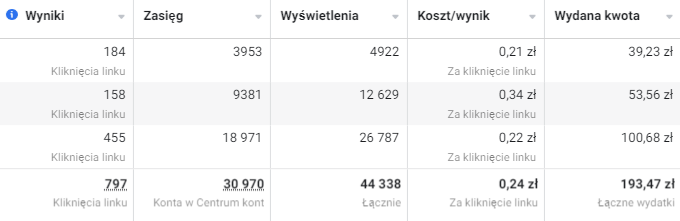 Jako przykład skuteczności naszych działań przedstawiam wyniki reklam profilu na Facebook'u, który dopiero powstał od zera. Są to wyniki z pierwszego miesiąca działań, a kliknięcia linku dotyczą wejść na stronę internetową klienta.